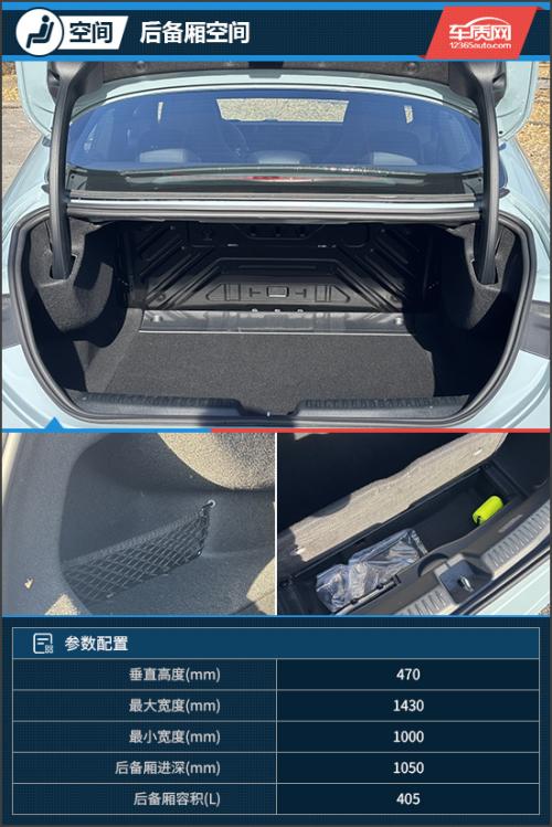 在乘坐空间方面,身高181cm的体验者调整好前排座椅后,无论横向还是纵向空间均十分充裕。保持前排位置不变,体验者进入后排后,头部空间约为3指、腿部空间约为1拳3指。虽然评测车定位为紧凑型车,但得益于加长的40mm轴距以及纯电平台对空间布局的优化,其后排乘坐空间并不局促。此外,中央扶手内集成了带有限位器的隐藏式杯架,固定水瓶等容器十分稳固。