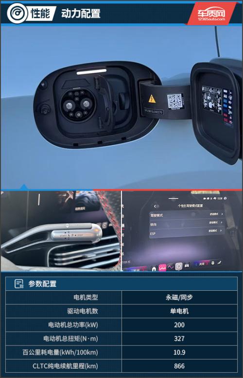 评测车基于800V电气架构打造,搭载后置单电机,电机总功率200kW、总扭矩327N*m,匹配能量为89kWh的动力电池,CLTC纯电续航里程为866km,充电10分钟续航可增加370km。