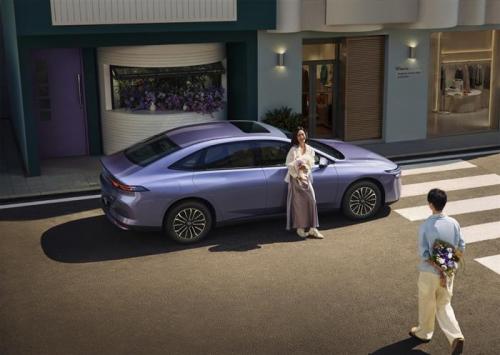 车身侧面,新车车身遵循0.618黄金比例,1.26宽高比塑造出修长稳重的姿态。风弧式极简腰线在后轮眉处微微外扩,如风拂过般自然。轮高比达2.1倍,保障后排空间不压抑。