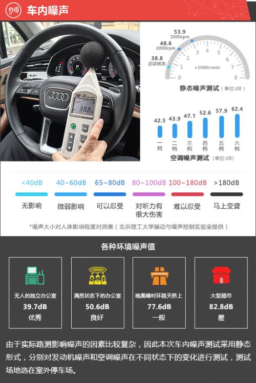 在静态噪声测试环节,2025款奥迪Q7在启动状态下车内实测噪声值为38.8dB,在测试过的同级别车型中处于中下游水平。从测试数据来看,发动机在2000rpm和3000rpm时,传入车内的噪声值分别为48.6dB和53.9dB,整体表现处于同级别车型中下游水平。