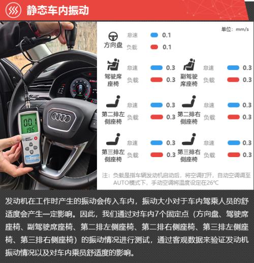 在静态车内振动测试环节,怠速状态下,2025款奥迪Q7方向盘位置的振动数值略低于前后排座椅。负载状态下,全车所有部位的振动数值均保持不变,对乘坐舒适性影响不大。