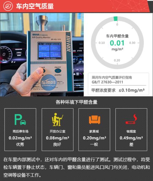 在车内空气质量测试环节,将车辆放置在车辆较少的内部地面停车场中,实测2025款奔驰纯电CLA的车内甲醛含量为0.01mg/m3,符合2012年3月1日起实施的,由原环保部和国家质量监督检验检疫总局联合发布的《乘用车内空气质量评价指南》(中华人民共和国国家标准GB/T 27630-2011)中的相关标准。
