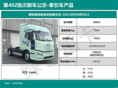 其中,绿色重卡发现解放牌一款轻量化、低风阻设计的4×2纯电动牵引车,其采用峰值功率530kW的电驱桥驱动,最大马力超700匹。