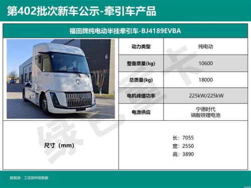据绿色重卡分析,本次北汽福田的申报车型均为此前Beacon干线概念车量产版本的补充申报,涵盖6×4车型与4×2车型,仅在动力层面上进行微调,并且全系预计将搭载宁德时代的600度磷酸铁锂大电池包。