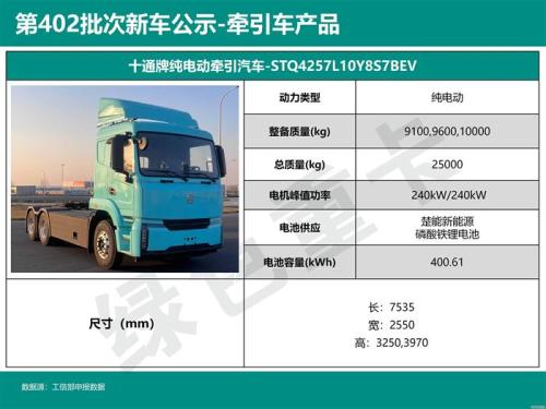 其中,绿色重卡发现十通牌一款搭载400度电量的纯电动半挂牵引车,或为零一雷震子的补充申报车型。动力方面,其采用双240kW峰值功率的电驱桥驱动。