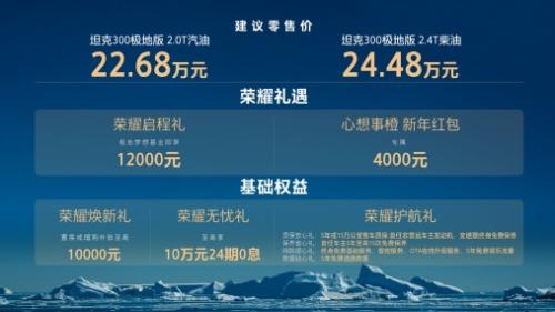 12月11日,坦克300极地版正式上市,2.0T汽油版本售价22.68万元,2.4T柴油版24.48万元,并推出荣耀启程礼、心想事橙新年红包和多项基础权益等多重购车礼遇。