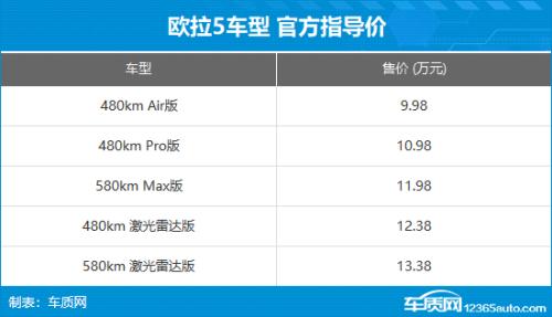2025年12月16日,欧拉5正式上市,新车共推出5款车型,官方售价9.98-13.38万元,限时换新价9.18万元起(限时换新价包含“订金礼”和“换新礼”至高5000元以旧换新补贴)。此外,即日起至2025年12月31日,用户下订并锁单即可尊享包含订金礼、换新礼、智行无忧礼在内的9重上市好礼,以及跨年购置税补贴(不含480km Air版)等购车权益。