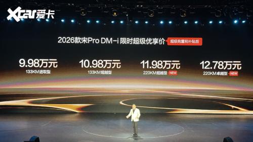 2026年1月10日,比亚迪正式宣布2026款宋Pro DM-i上新220km长续航版本,全系限时超级优享价9.98-12.78万元。新车实现CLTC纯电续航220km、满油满电综合续航1600km、NEDC百公里亏电油耗。