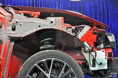 在前排乘客脚下,我们能看到中部设置的两道纵向加强梁,该结构同样是为了提高乘员舱的强度,以便在碰撞中最大限度降低乘员舱变形程度,保障乘员生存空间。