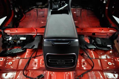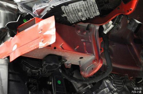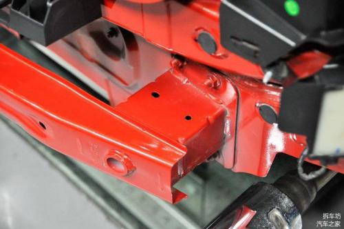 另外就是车身底板本身冲压出的凹槽,也是为了提高车身底板的刚度和抗扭度,同时车身底板还黏贴了部分止震贴。