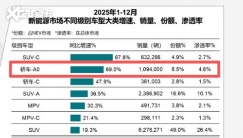 据乘联会发布的官方数据显示,2025年全年,A0级新能源汽车累计销量超235万辆,占全年新能源汽车总销量的比重接近8.5%,且同比增速达到69%,持续高于新能源市场整体增速,展现出强劲的增长活力。