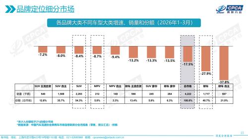 先看整体大盘。乘联分会的数据显示,2026年一季度,轿车市场卖了171.7万辆,占整体市场的40.7%;SUV市场卖了229.3万辆,占比54.3%。但在不同细分领域,攻守态势截然不同。