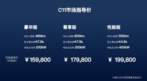 以C11为例,从此前公布的参数来看,这款车电机最大总功率400kW,百公里加速成绩小于4.8秒,同时NEDC续航超过550km——这样的数据,放在任何一款同等级别的车型上基本都是30多万起步,而C11顶配指导价格也不过19.98万元,这还不提最早一批下定用户使用2万抵4万权益后再降2万的实际终端价,可见,性价比毫无意外地会成为这款车的优势,多等几个月就多等几个月吧。