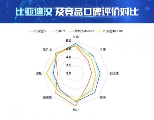 在竞品圈中,今年市场销量排名第2的汉,用户口碑总体评分为4.58,在竞品圈中总体评分最高。从用户评价来看,汉在外观、动力方面用户评价较好,但在能耗、操控性方面有待提升。