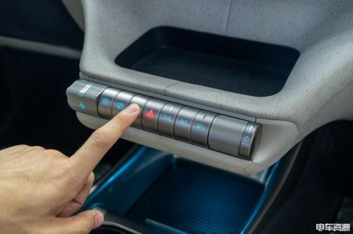 中控下方是仿金属材质的一排常用按钮和电子挡把,包括驾驶模式、动能回收调节、双闪、空调、除霜以及多媒体音量调节滚轮。