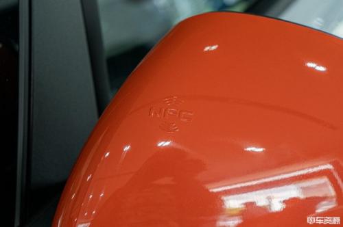 橙色的后视镜搭配黑色的支架,安装在浅灰色的车身上,营造出十分特别的效果。后视镜罩上印有NFC的标志,表示海豚可以使用NFC手机钥匙来解锁车辆。