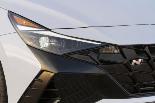 相比已经发布的普通版伊兰特,伊兰特N车头大面积的黑色饰板虽然看上去不很精致,不过独特的车身配色彰显了新车的不凡身份。同时,新车前包围下方还配备了红色饰条,能够进一步提升车辆的运动属性。
