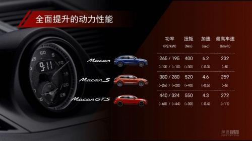 新款Macan S:搭载2.9升V6双涡轮发动机,输出功率达280kW(380PS),较此前提升了20kW (26PS),从静止加速到100km/h仅需4.6秒,最高车速达259km/h。