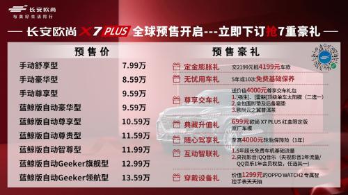 “7重当红豪礼”囊括了包括交2199元抵4199元车款、至高4000元轮胎保障险、价值4000元尊享交车礼包、车机端基础流量5年内全免费、5年或10次全国联保免费基础保养,下单即可获赠价值699元的限量版长安欧尚X7 PLUS红盒限定版原厂车模在内的多项福利,以及免费抽取价值1299元的OPPO WATCH2智能手表的机会。