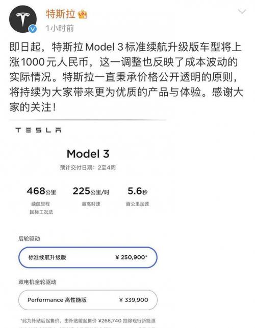 5月8日,我们从官方获悉,特斯拉对国产Model 3标准续航后驱升级版进行了调价,上涨1000元人民币,调整后该车型补贴后售价为25.09万元,而Model 3 Performance高性能全轮驱动版价格则没有变动。