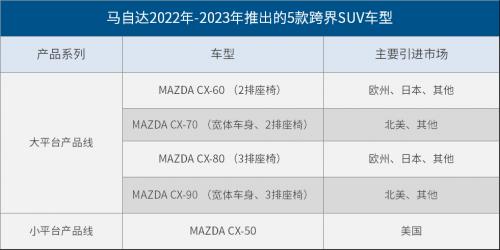 根据计划,马自达将在2022年至2023年间推出5款跨界SUV车型,分别是:“MAZDA CX-50”、“MAZDA CX-60”、“MAZDA CX-70”、“MAZDA CX-80”以及“MAZDA CX-90”。