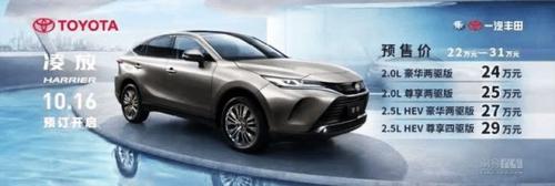 日前,根据一汽丰田官方信息:旗下全新中型SUV——凌放的预售价正式公布。新车预售价区间22-31万元,同时还公布了其中四款配置的具体预售价,分别为:2.0L豪华两驱版(预售24万)、2.0L尊享两驱版(预售25万)、2.5LHEV豪华两驱版(预售27万)、2.5L HEV尊享四驱版(预售29万)。新车将于11月份开幕的广州车展正式上市。