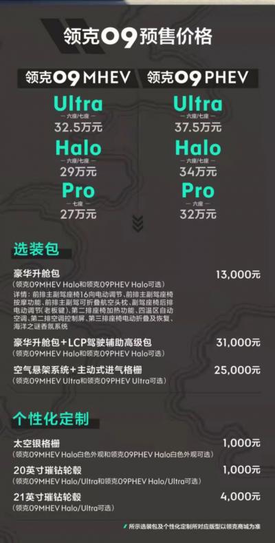 今日晚间,领克品牌首款中大型SUV车型领克09将正式上市,新车定位于中大型SUV,基于沃尔沃SPA平台打造,是品牌中的旗舰车型。新车提供MHEV和PHEV等多种动力可选,并提供6座和7座版本来满足不同用户的需要。目前新车已经发布预售价格,其中,MHEV推出3款车型,预售价格27-35万元;PHEV也推出3款车型,预售价区间为32-40万元。