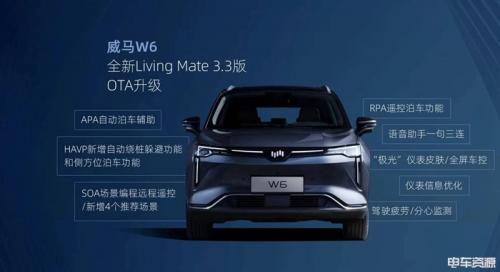 与此同时,威马W6也迎来了新的OTA升级,车辆升级至了Living Mate 3.3版本。新的升级点包括APA自动泊车辅助、HAVP新增自动绕桩躲避功能和侧方位泊车功能、SOA场景编程远程控制、RPA遥控泊车功能、“极光”仪表皮肤等。