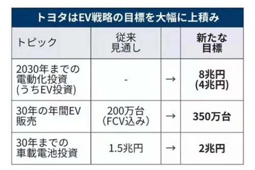 *到2030年将累计投入8万亿日元(折合人民币4,480亿元),用于技术研发和设备投资,其中4万亿日元(折合人民币2,240亿元)用于纯电动领域;