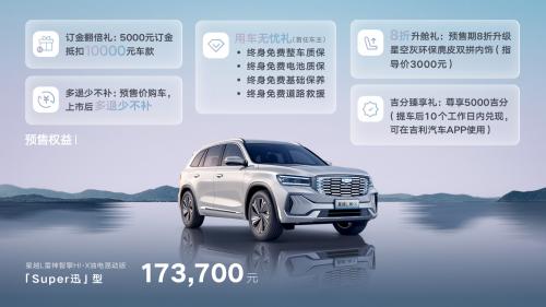 预售期间,星越L雷神Hi*X油电混动版还为用户准备了多项限量预售权益:5000元订金抵扣10000元车款的订金翻倍礼;预售价购车,上市后多退少不补;首任车主尊享的用车无忧礼,包括终身免费整车质保、终身免费电池质保、终身免费基础保养、终身免费道路救援;预售期8折升级星空灰环保麂皮双拼内饰的8折升舱礼;尊享5000吉分臻享礼。
