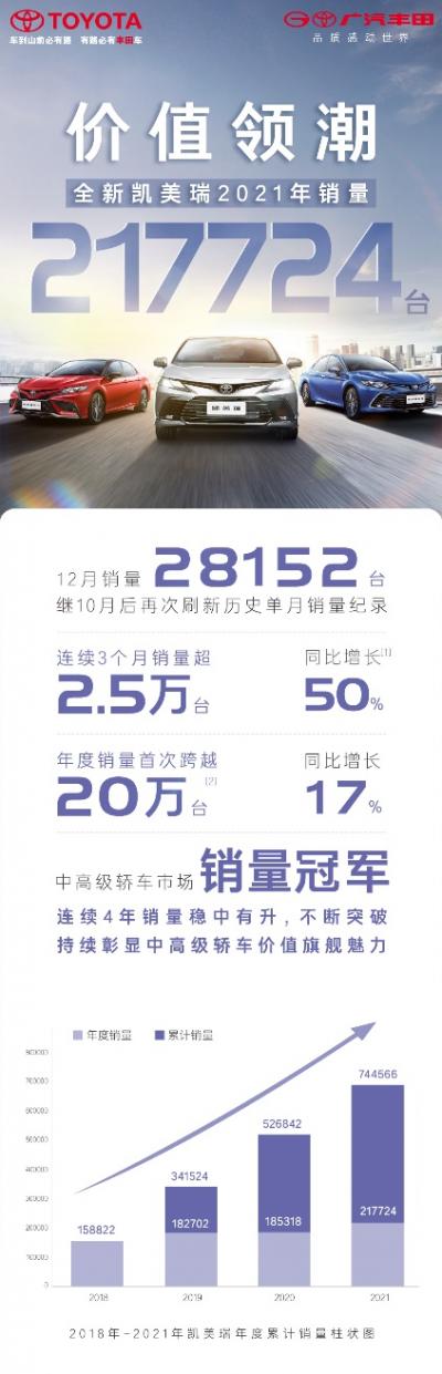 新年伊始,广汽丰田全新凯美瑞晒出了2021年亮眼的销量成绩单,全年销量217724台,同比增长17%,创历史新高,位列中高级轿车市场销量第一。对于这个结果,大家并不意外,因为早在10月开始,全新凯美瑞已喜讯连连:10-12月连续三月销量突破2.5万台,其中12月销量高达28152台,刷新历史单月销量最高纪录,三度蝉联细分市场销量冠军。