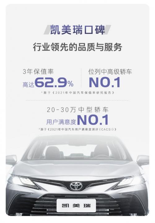 除了不断突破革新的产品力,行业领先的高品质和服务也是凯美瑞持续热销的重要保障。得益于高品质,凯美瑞养护成本远低于同级车型,保值率在细分市场名列前茅。在《2021年中国汽车保值率研究报告》中,凯美瑞3年保值率高达62.9%,位列同级第一。服务方面,在《2021年中国汽车用户满意度测评(CACSI)》中,广汽丰田再次蝉联销售和售后服务满意度双料冠军,凯美瑞蝉联20-30万中型轿车汽车用户满意度第一。
