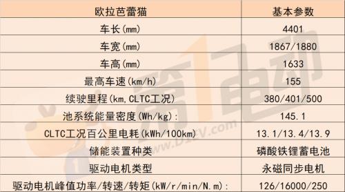 动力方面,搭载的是由联合汽车电子有限公司提供的最大功率为126kw的电机提供最大扭矩250牛*米,最高车速为155km/h。共有三种续航版本可选,分别是在CLTC工况下续航里程为380km(百公里耗电量13.1kWh/100km)、401km(百公里耗电量13.4kWh/100km)、500km(百公里耗电量13.9kWh/100km)。均搭载磷酸铁锂电池,电池系统能量密度为141.3Wh/kg。