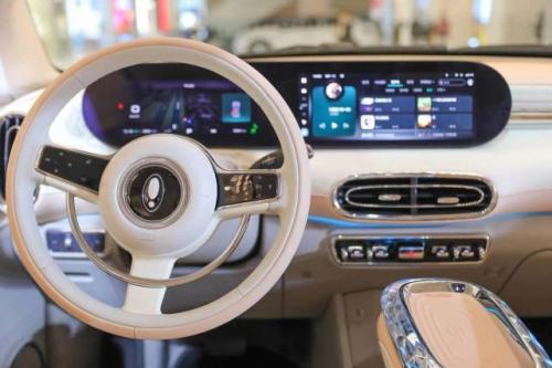内饰方面,整体为复古奢华风,采用金属点缀,在方向盘处、空调出口、扶手等,大量使用了圆形弧形等设计元素,如空调出风口、中控旋钮、音响罩等,双联一体液晶大屏的设计与好猫相似。