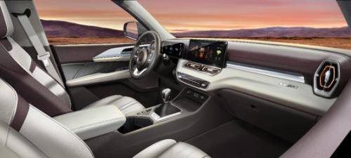 金刚炮秉承“极简美学”理念,打造更具现代、科技、时尚元素的智能座舱。从这次官方公布的照片来看,金刚炮也全面换成了液晶仪表和液晶中控。仪表盘和中控屏采用无边界悬浮双屏设计,非常有科技感。如果光看内饰,是很难把它和皮卡这个产品联系到一起的。另外内饰中也采用了多种撞色的设计,材料之间的拼接也体现出了高级乘用车产品的高级感。