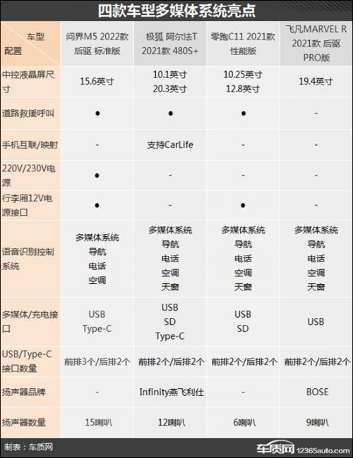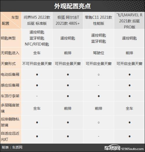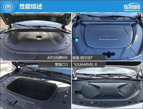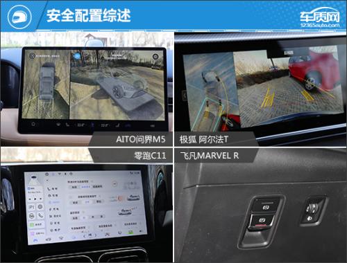 由于车型定位以及售价等因素,四款车型在基础配置上非常全面,但是在细节配置上则各有千秋,其中作为入门车型的问界M5整体配置较为全面,蓝牙/NFC钥匙、全车无钥匙进入、全车多层隔音玻璃增加了自身实用性,此外该车还配备了超大的全景天幕,增加了车内采光效果。MARVEL R和极狐阿尔法T在四款车型中整体配置几乎没有什么的短板。而对于零跑C11来说,在细节配置上的表现不如其余三款车型,而这或许也与其相对较低的售价有关。