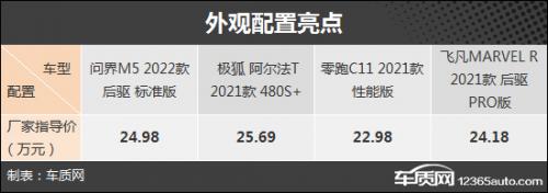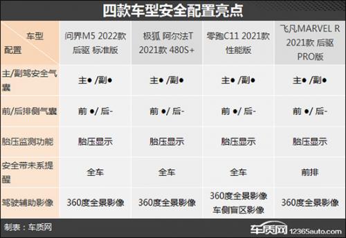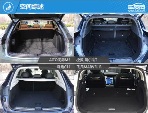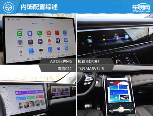 动力上,四款车型中零跑C11动力表现要强于其余三款车型,且纯电续航里程也处于同级别领先优势,同时该车也是四款车中唯一的四驱车型。问界M5搭载了增程式动力,该车纯电续航里程虽然不及其它三款车型,但得益于增程器的加入,综合续航里程可超过1000km;MARVEL R纯电续航表现仅次于零跑C11车型,505km的纯电续航也能满足我们出行需求。极狐阿尔法T由于推荐车型原因,纯电续航里程不如零跑C11和MARVEL R。