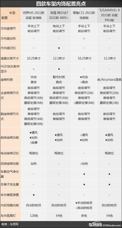 在其他配置方面,四款车型也展现出较高的性价比,皮质座椅、座椅加热、主副驾驶座椅电动调节等均有配备。在舒适性配置方面,问界M5表现相对更全面,主副驾驶座椅提供多种调节方式,还配备了前后排座椅加热、前排座椅通风、128色氛围灯。值得一提的是,问界M5还配备了同级少见的车内香氛装饰,同时提供了前排座椅按摩的选装机会。极狐阿尔法T则相对常规一些,但HUD以及方向盘记忆的加入还是提升了用车便利性;而零跑C11和MARVEL R表现较为接近,同样可圈可点。