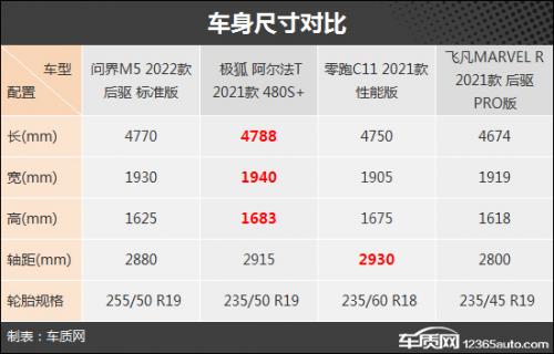 虽然本次推荐的四款车均为中型SUV,但是在尺寸方面各车型还是略有差距,其中极狐阿尔法T在长宽高方面占据绝对优势,紧随其后的为问界M5。零跑C11车身尺寸不及其余三款车型,但好在2930mm的轴距为其扳回一城。