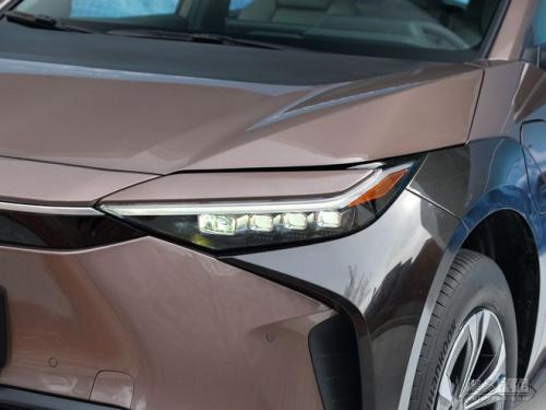外观方面,一汽丰田bZ4X(参数|图片)的外观延续海外版整体设计,新车采用全新的设计语言,其中封闭式前格栅搭配狭长大灯,使得整个车头呈现出“锤头”形态,显得十分可爱与科幻。而左右两侧的黑色饰板从大灯周围一直延伸到两侧翼子板处,形成独有的设计元素。前大灯内部四颗方形LED光源呈矩阵式设计,看上去囧囧有神,此外,上方的LED日间行车灯带与中间的镀铬饰条相连接,进一步提升车头的整体感。