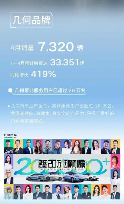 汽车信息网5月16日讯日前,吉利汽车公布了最新销量数据:4月乘用车销量72153辆,位居行业第二。今年1-4月累计销量398177辆,新能源占比持续增加。具体来看,吉利新能源领域车型(含吉利、几何、领克、极氪、睿蓝)4月销量15636辆,占总销量比重约22%。 其中,几何品牌成为了吉利新能源的销量扛把子,4月销量7320辆,今年累计销量达33351辆,同比增长了419%,累计服务用户正式突破20万名,这样的成绩让一众造车新势力都汗颜,特别是在4月这个疫情反复、供应链受阻的艰难月份,几何汽车算得上是“闷声发财”的代表了。
