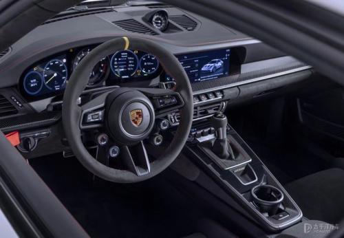 内饰部分,全新911 GT3 RS在传统指针式转速表双侧增加了一对液晶屏幕的搭配,另外中控显示屏也出现在了新车上,中控屏下方还保留有部分物理功能控制按键。值得一提的是,看上去和机械的手动挡挡杆相类似的换挡杆,其实是7速PDK变速箱的档杆,官方希望能够为驾驶者提供类似序列式变速箱的换挡体验。