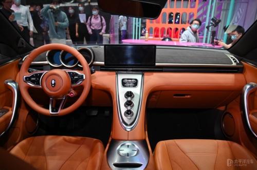 从此前广州车展上亮相的实车来看,新车内饰部分整体以黄色为主,在方向盘、门把手、中控台等区域配以镀铬,座椅和扶手箱等区域还有精致的手缝线,视觉效果和质感都不错。中控台采用“T”字型设计,绝大多数实体按键都被取消,在中控台上方配有一块悬浮式液晶屏幕,下方还配有一块很小的竖屏。仪表盘采用了跑车上比较常见的炮筒造型,很有性能范儿,内部为圆形的液晶显示屏幕,这种传统与现代相结合的搭配非常巧妙。方向盘采用了四辐式设计,造型复古,在方向盘两侧分布着驾驶辅助和多媒体控制按键。