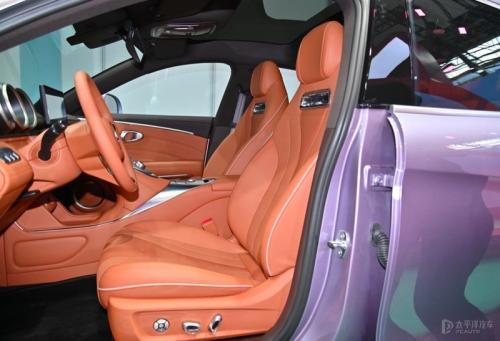 新车采用了四座设计,由于是纯电动车型,机械结构更加紧凑,车头内部结构对于乘员舱空间侵占得比较小。实际乘坐体验上、前排的头部空间和后排的腿部空间都不错,这台车的车顶由两块巨大的玻璃组成,采光效果很好,坐进车内非常通透,没有传统跑车那种压抑感,不过后排车顶的溜背式设计还是对头部空间产生了一定的影响。