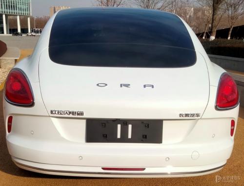车尾部分,通过巨大的玻璃溜背车顶可以看到车内,在车顶装配面积如此大的玻璃,在目前的量产车型中还是十分少见的,尾灯组采用了椭圆形设计,车尾线条饱满圆润,与车头相呼应,在后包围上还有一条金色的装饰条贯穿左右。