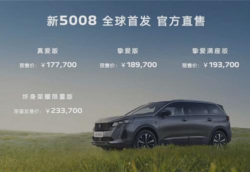 【太平洋汽车新车频道】近日,我们从相关渠道处获悉,新款东风标致5008(询底价|查参配)将于11月25日正式上市。新车此前已开启预售,共推出4款车型配置,预售价格范围为17.77-23.37万元。作为改款车型,新车换装全新盾型LOGO标识,整体设计和现款车型则维持一致,而在多项配置上也有一定的提升。这前预售发布会上,官方还带来了售价为23.37万元的终身荣耀限量版车型,限量发售399台。
