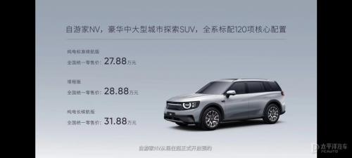 自游家NV共推出3款车型,官方指导售价为27.88-31.88万元。新车定位为中大型5座SUV,并提供两种动力系统,其中纯电标准续航版CLTC工况下续航里程为440km;纯电长续航版CLTC工况下续航里程为560km;增程版车型CLTC工况下综合续航里程超过1257km。