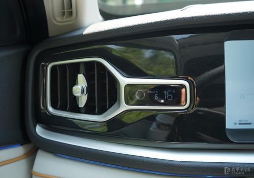 仪表板两端的空调出风口设计了2枚Mini健康显示屏,方便用户读取温度/风量/PM2.5等舒适相关信息。配合HEPA级滤芯的新风过滤系统,AQS空气质量控制系统每秒20次实时监测空气质量信息,在车外空气质量欠佳时自动切换新风模式。