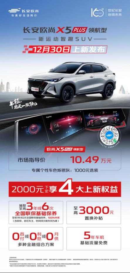 汽车信息网12月30日讯今日,“新运动智趣SUV”全新车型——欧尚X5 PLUS领航型上市发布,新车上市指导价10.49万元。伴随着欧尚X5 PLUS领航型的上市,官方同步也推出了购车福利,当前下定欧尚X5 PLUS,可享4大上新权益,包括:抽取至高3年或6次全国联保基础保养,至低1年或2次全国联保基础保养,100%中奖(含首保,首任车主,时间或次数先到为准);至高3000元置换补贴;0首付或0利息或0月供多种金融组合方案;5年车机基础流量免费等,让年轻人轻松入手,用车无忧。
