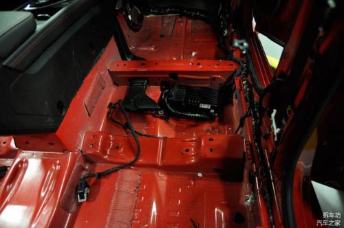 在前排乘客脚下,我们能看到中部设置的两道纵向加强梁,该结构同样是为了提高乘员舱的强度,以便在碰撞中最大限度降低乘员舱变形程度,保障乘员生存空间。